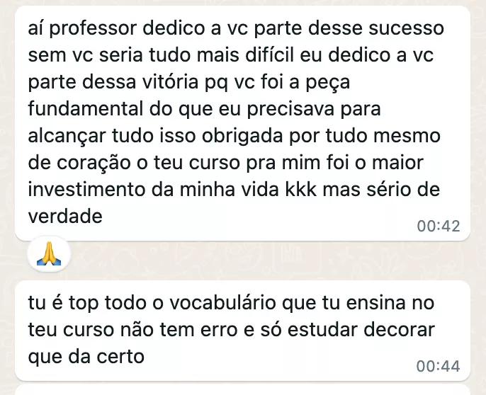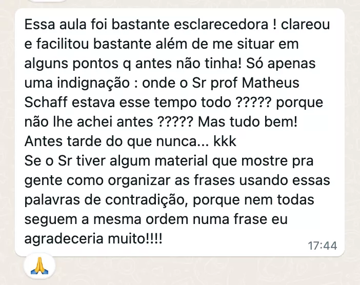 Uma vez por semana os alunos do Mestre da Declinação têm um encontro ao vivo para tirar dúvidas, analisar erros e acertos. É o melhor suporte do Brasil para você!